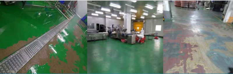 食品加工車間地坪長時間的水沖擊、有機酸腐蝕、油污腐蝕等造成水磨石、瓷磚地面表面破損嚴重,掉顆粒,容易滋生細菌;